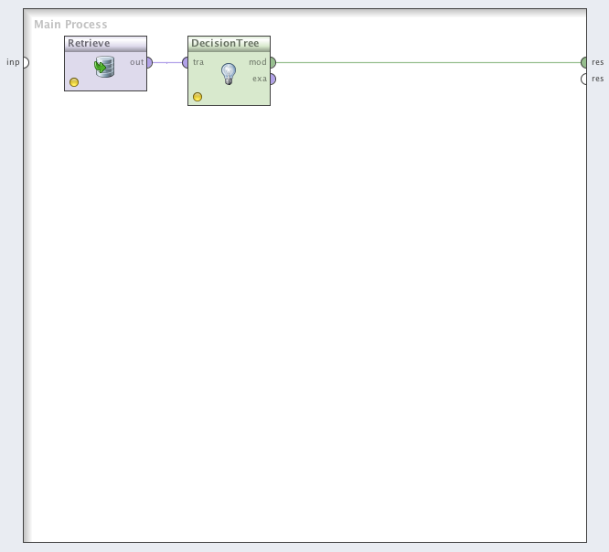 <table><tr><td><p>This process starts with loading the data. After finishing the input operator a typical learning step is performed. Here, an implementation of a decision tree learner is used which also can handle numerical values (similar to the well known C4.5 algorithm).</p></td><td><icon>groups/24/learner</icon></td></tr></table><p>Each operator may demand some input and delivers some output. These in- and output types are passed between the operators. In this example the first operator &quot;Input&quot; does not demand input and delivers an example set as output. This example set is consumed by the learner which delivers the final output: the learned model. </p><p>Since this is a linear data flow such a process design is called &quot;operator chain&quot;. Later we will see more sophisticated processes in the form of operator trees.</p><p>Try the following:</p><ul><li>Press the &quot;Play&quot; icon in the icon bar at the top of the frame. The process should start and after a short time the message viewer in the bottom part of the frame shows the message that the process was successfully finished. The main frame changes to &quot;Result&quot; view which shows the learned decision tree (a hypothesis which is called Model in RapidMiner). <table><tr><td><icon>24/media_play</icon></td><td><i>&quot;Play&quot; button to start the process</td></tr></table></li><li>Change back to the edit mode (either via the View menu entry, via the icon in the upper right corner, or via the shortcut F9). Replace the learner by another learning scheme for classification tasks (right click on decision tree learner and replace operator). You can use the RuleLearner for example. After running the changed process the new model is presented.<table><tr><td><icon>groups/24/learner</icon></td><td><i>Replace the decision tree learner by a RuleLearner.</i></td></tr></table></li></ul>