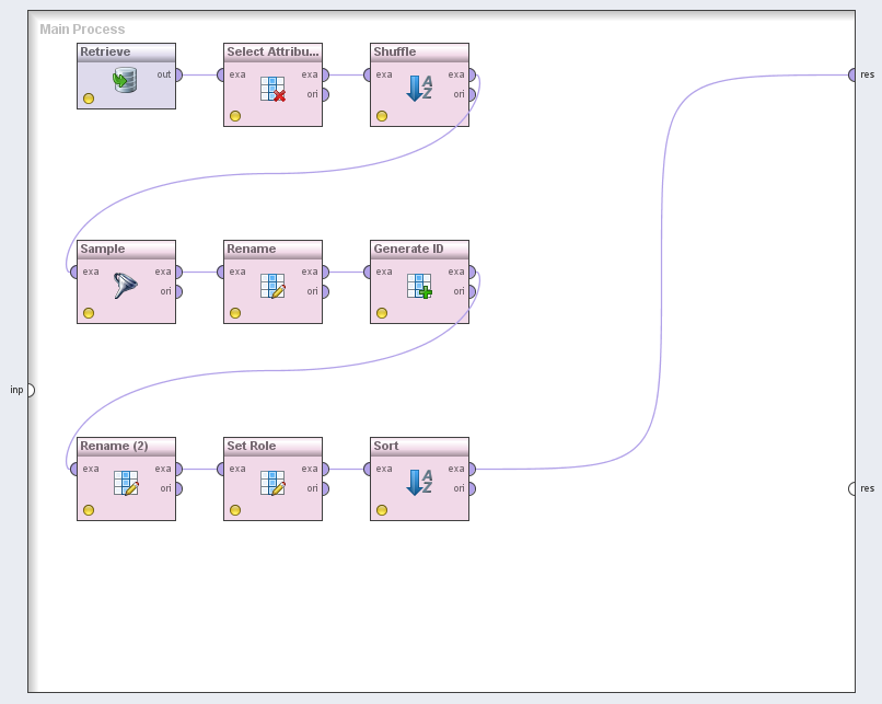The process essentially creates a random subsample of the item IDs and by means of Generate ID operator it creates the score of the recommendation.