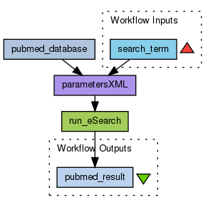 This workflow takes in a search term (as used in the normal PubMed interface) and retrieves a list of PubMed ids in xml