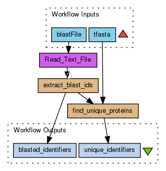 The workflow parses uses the blast results to determine the unique proteins found in the target genome that have no similairty to the source genome. Using these unique protein ids, and the original target protein fasta file, a fasta file of unique proteins is created.