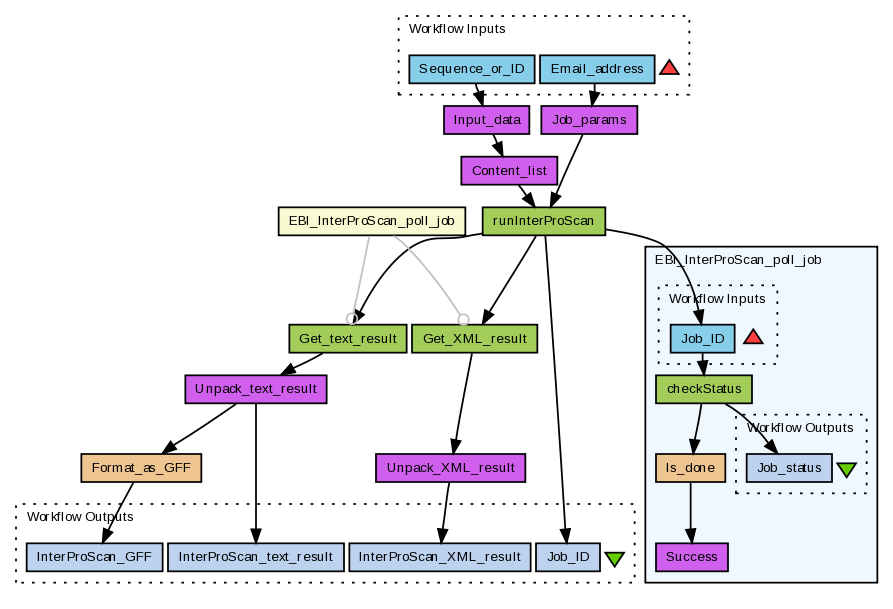 Perform an InterProScan analysis of a protein sequence using the EBI’s WSInterProScan service (see http://www.ebi.ac.uk/Tools/webservices/services/interproscan). The input sequence to use and the user e-mail address are inputs, the other parameters for the analysis (see Job_params) are allowed to default.