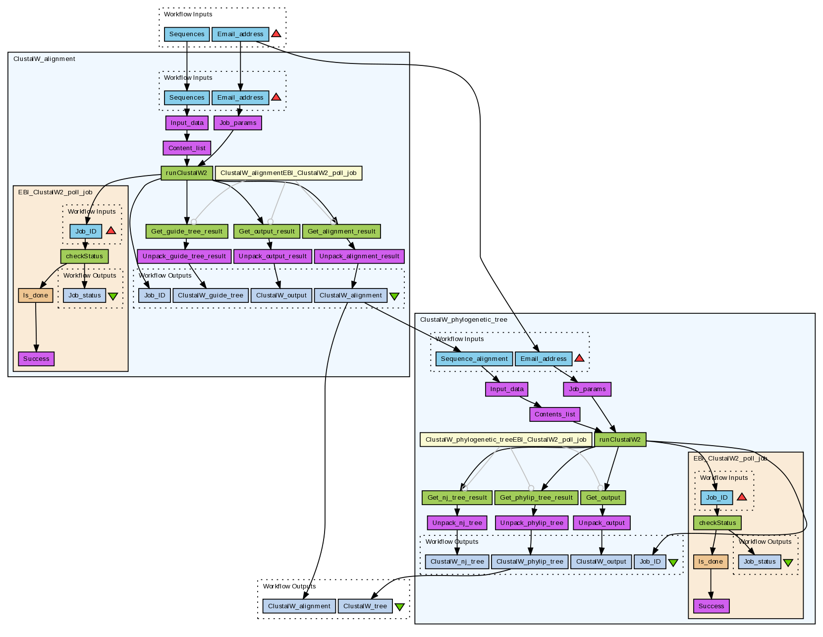Given a set of sequences perform an multiple sequence alignment and from the multiple alignment derive a phylogenetic tree. The popular ClustalW program (see http://www.clustal.org/), as implemented in the EBI's WSClustalW2 service (see http://www.ebi.ac.uk/Tools/webservices/services/clustalw2) is used to perform both tasks.