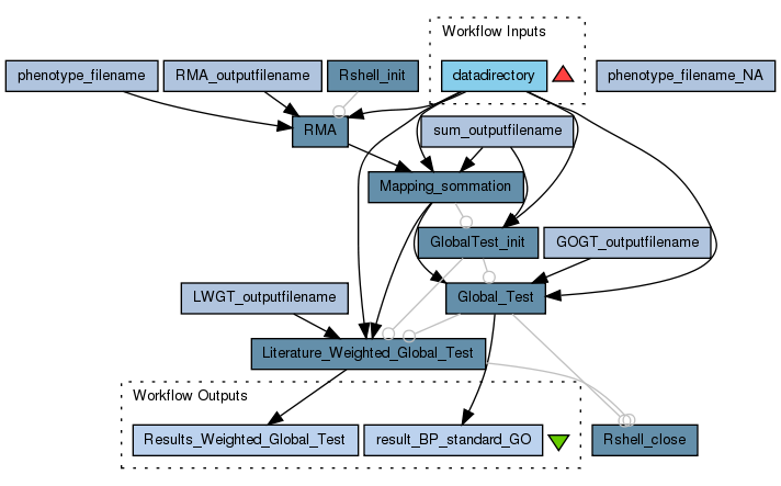 This workflow adds meaning to gene expresion values by performing a standard and a literature weighted Global Test. Gene expression is expected to be from Affymetrix microarrays, for which an RMA normalization and entrez Gene ID mapping/summation is performed.