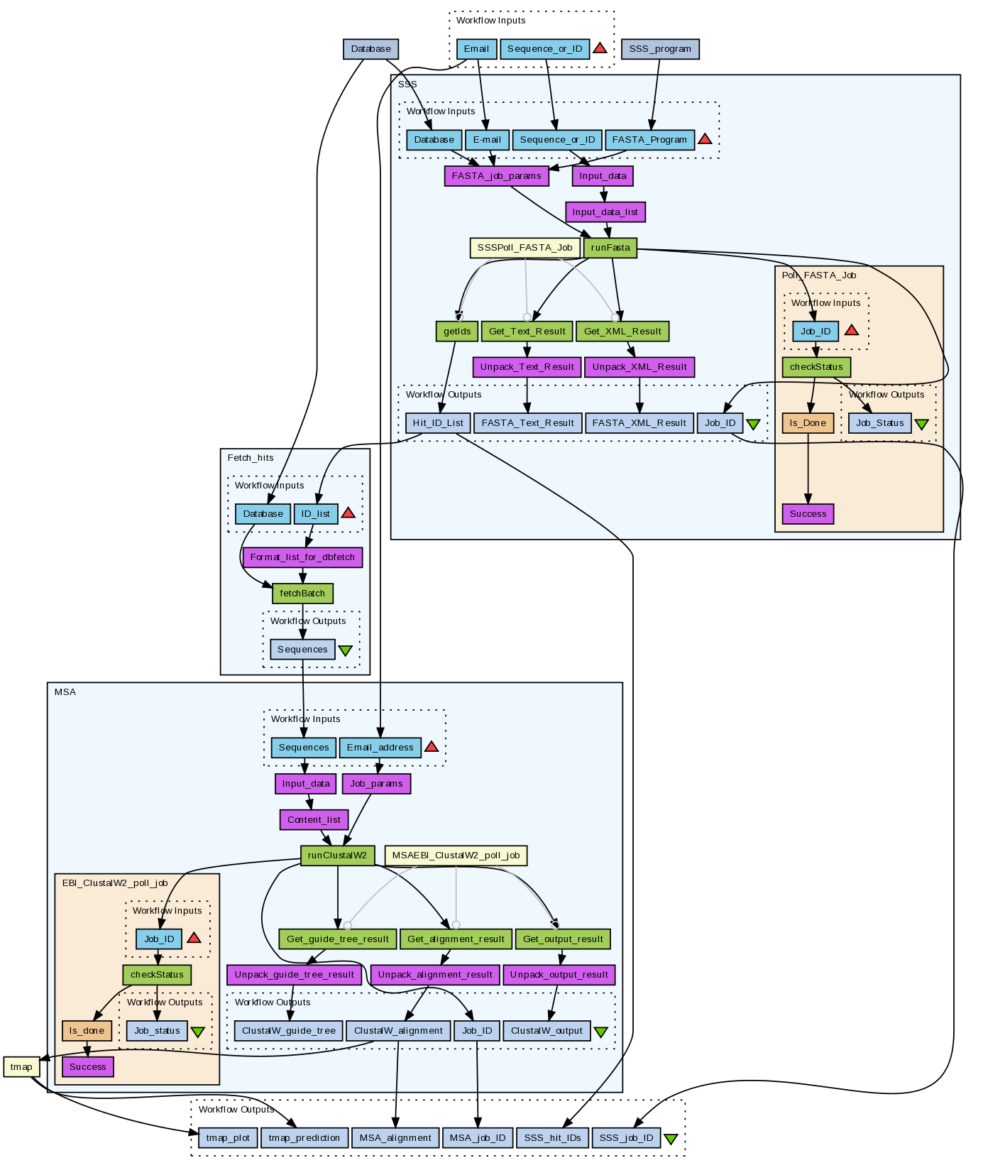 Attributions: Workflow EBI_ClustalW2 Workflow EBI_ClustalW2_phylogentic_tree Workflow EBI_dbfetch_fetchBatch Workflow EBI_WU-BLAST