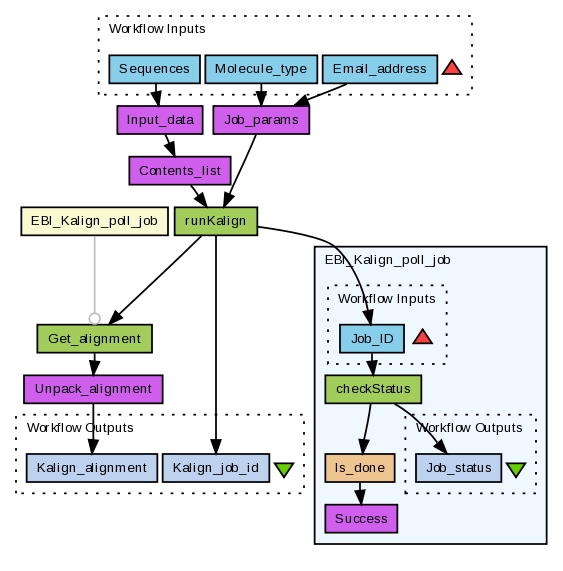 Multiple sequence alignment using the Kalign tool. This workflow uses the EBI's WSKalign service (see http://www.ebi.ac.uk/Tools/webservices/services/kalign) to access the Kalign tool. The set of sequences to align and the molecule type (protein or nucleic acid) are the input, the other parameters for the search (see Job_params) are allowed to default.