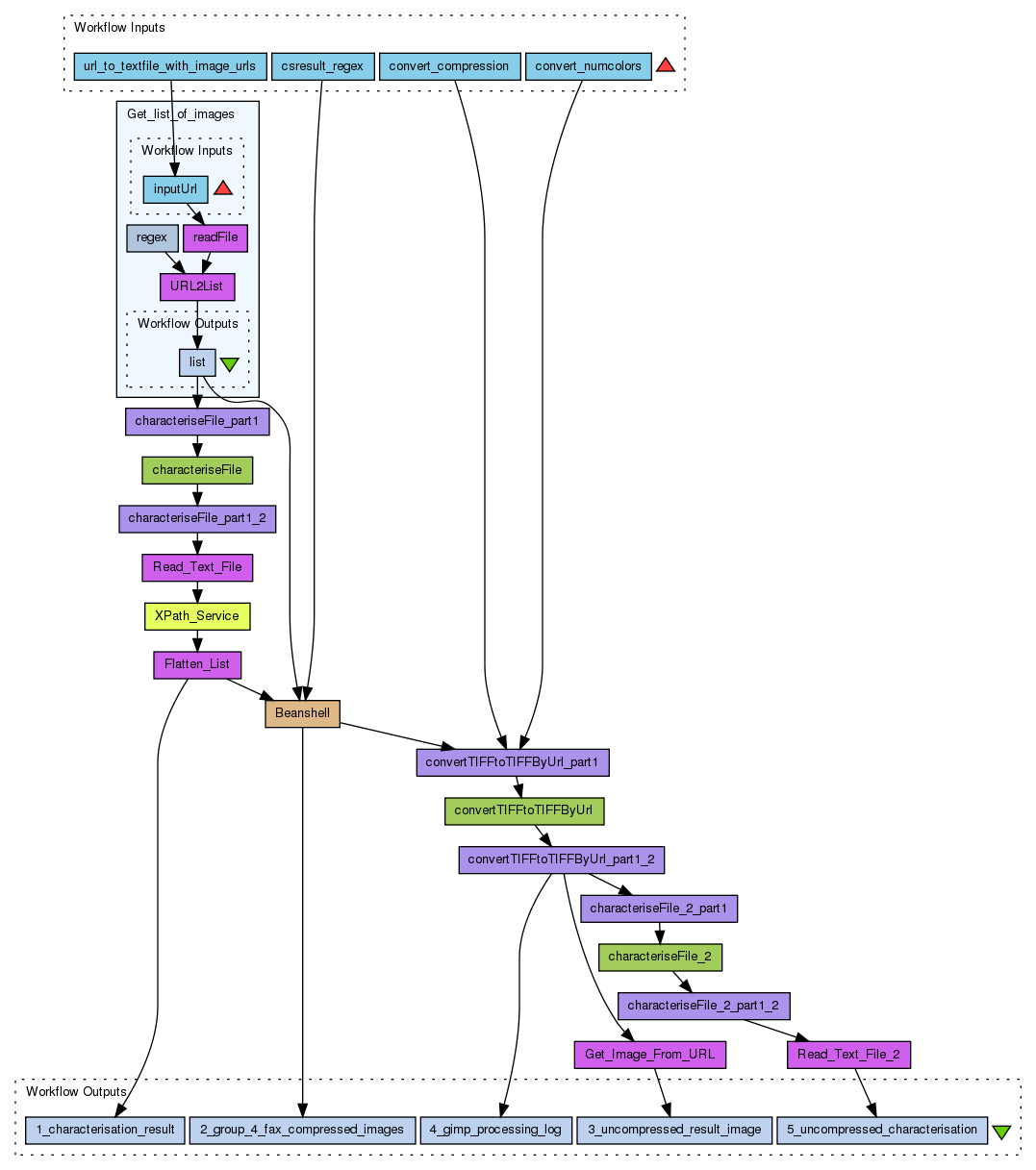 The workflow takes a list of TIFF images as input, identifies the "Group 4 Fax" comressed TIFF images and converts them to uncompressed TIFF images using GIMP. Finally it characterises the converted image.