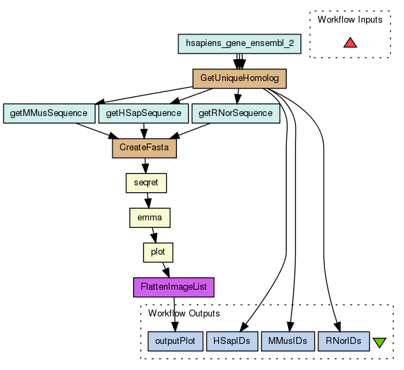 This workflow retrieves all genes on human chromosome 22 that are associated with a disease and aligns the upstream regions with mouse and rat homologues. The alignments are plotted and corresponding sequence ids are also returned. |
