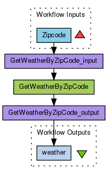 This workflow uses an input port to take a list of zipcodes as input. Using the "GetWeatherByZipcode" service ('USA Weather Forecast' web services from WebserviceX.net), the weather forecast is retrieved for each of the zipcodes from the input. These forecasts are output as XML trees.