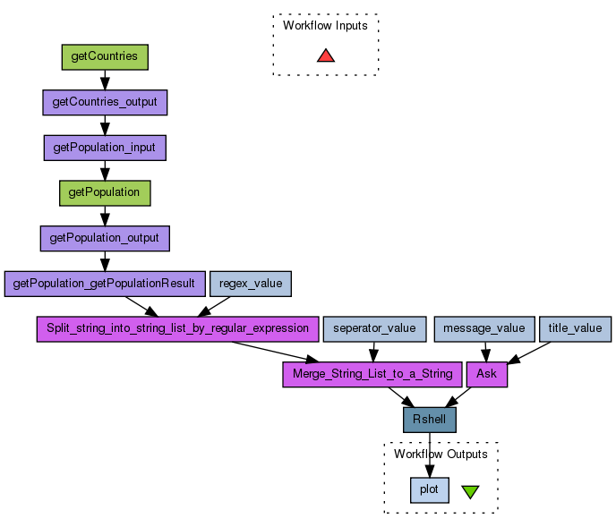 This workflow fetches the details of the countries in the world and then uses R to produce a histogram of the log of their population Based on Population histogram in R by Alan R Williams