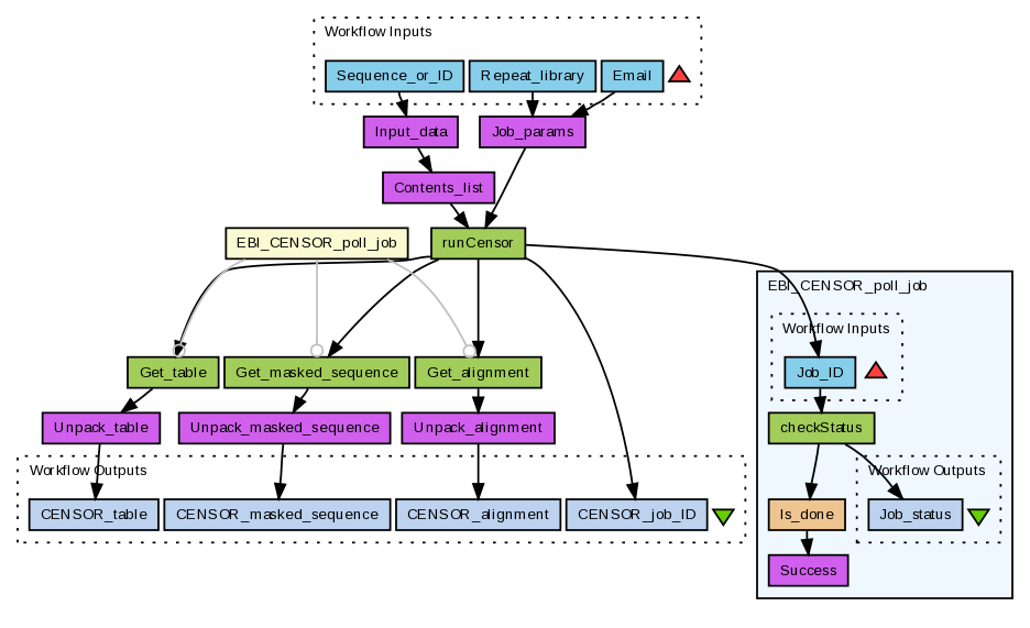 The CENSOR tool identifies and masks simple and complex sequence repeats found in nucleotide and protein sequences. This workflow uses the EBI's WSCensor web service (see http://www.ebi.ac.uk/Tools/webservices/services/censor) to access the tool.