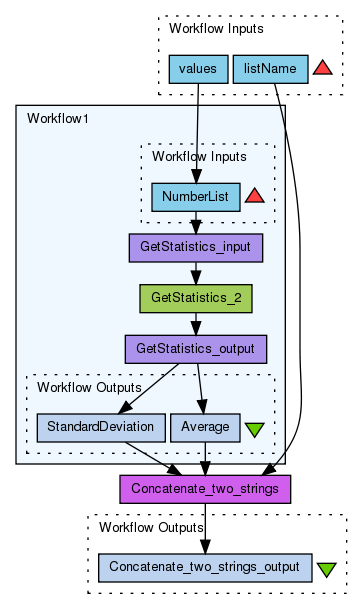 This workflow takes in a list of values and a list name, and returns the list name, average, and standard deviation of the values.