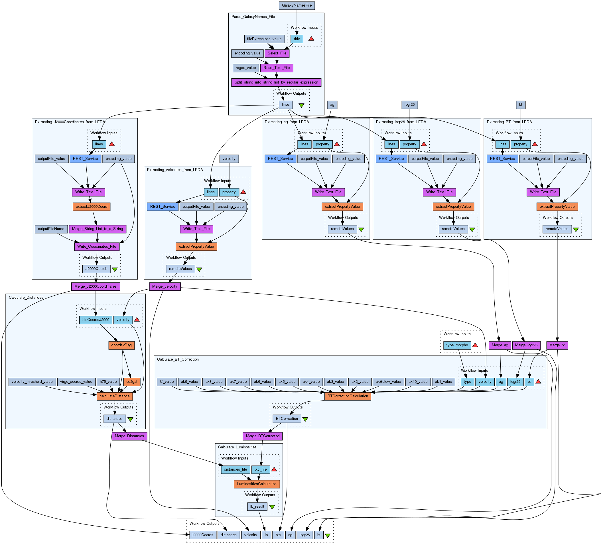 This workflow receives a list of galaxy names (hyperLEDA names. ie: KIG0001) and a file with the morphological types of those galaxies Using the name of a galaxy, the workflow querys Hyperleda to extract some properties of this galaxy (J2000 Coordinates, velocity, galactic extinction,log of axis ratio, and the Total B-magnitude ). With this properties it calculates the distance of the galaxy and, in other hand, the Total apparent corrected B-magnitude. It takes account if the velocity of the galaxy is lower than a threshold (1000km/s), it can not be possible to calculate the distance so, in those cases the distance will be "NaN". At the end, it calculates the Total Luminosity using the velocity and the Total apparent corrected B-magnitude. More information in the nested workflows.