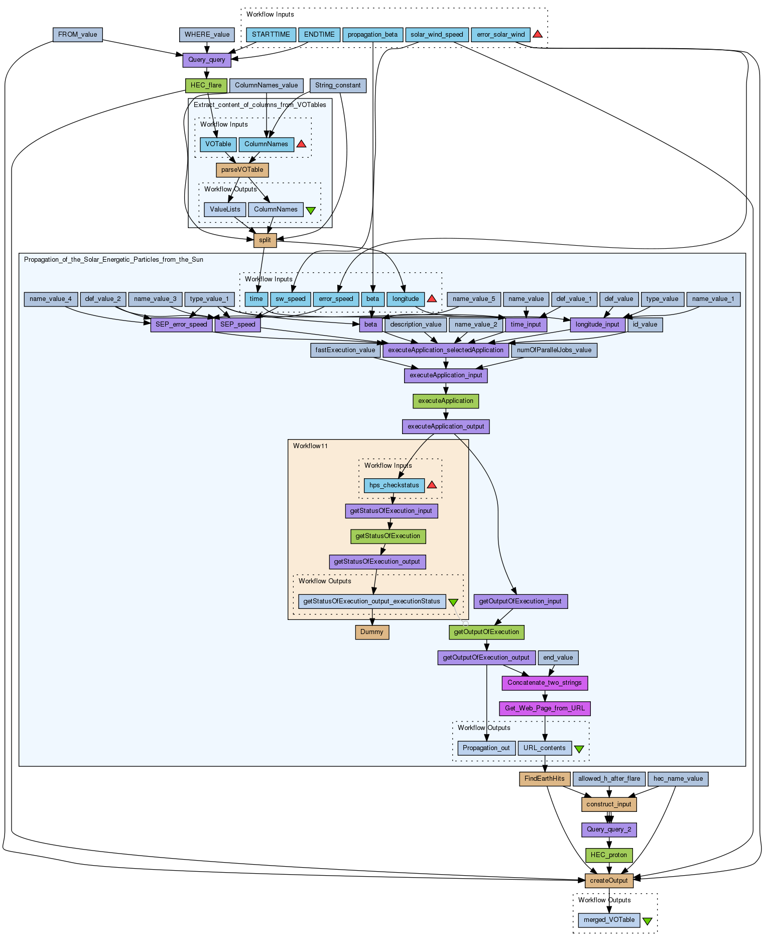 This workflow uses flares listed in the goes_sxf_flare list, checks wether this flare is connected to Earth via the Parker spiral, and looks for proton events at earth listed in the goes_proton_event list.