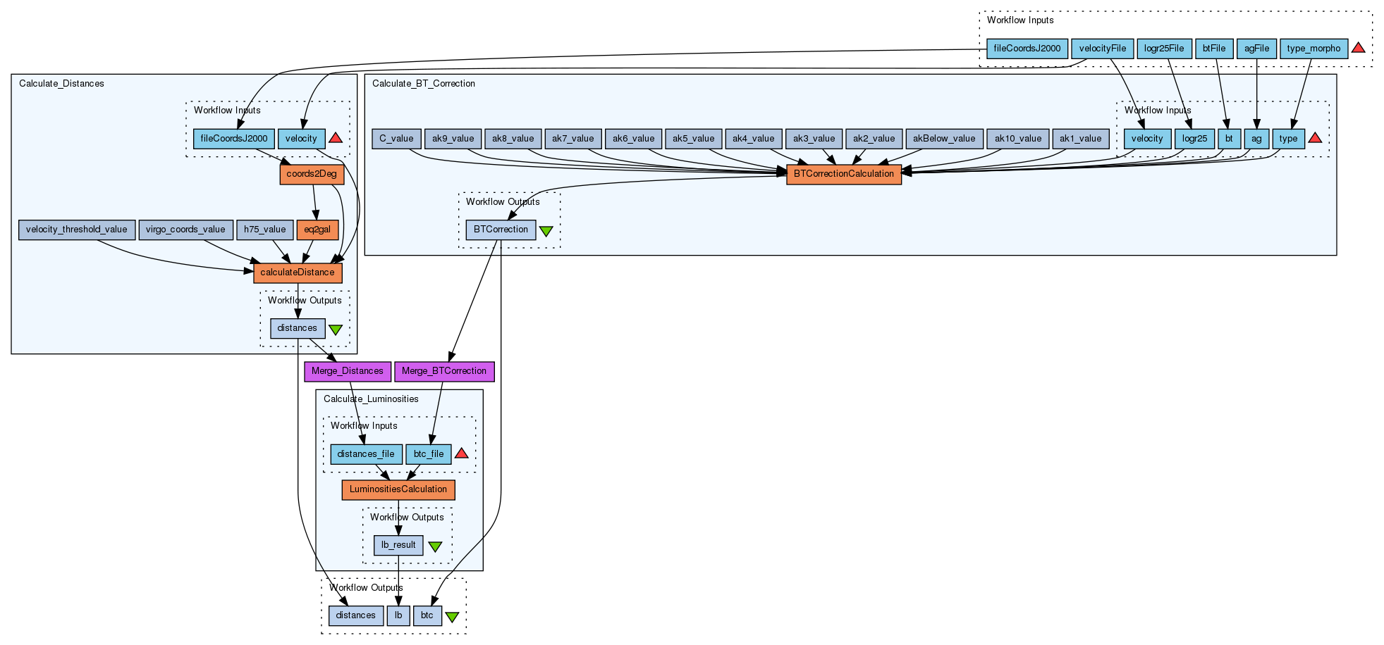 This workflow takes as input a file for each of this properties: J2000 Coordinates, velocity, galactic extinction,log of axis ratio, and the Total B-magnitude. With this properties it calculates the distance of the galaxy and, in other hand, the total apparent corrected B-magnitude.