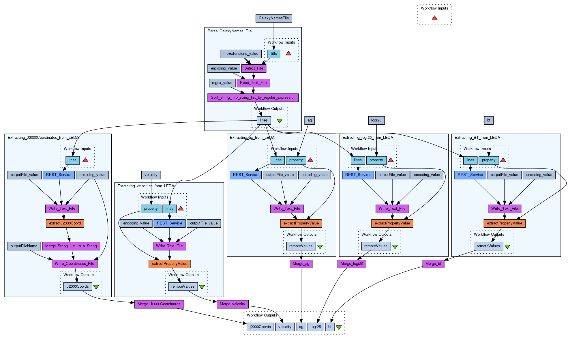 The user provides an ASCII text file with a list of galaxy names, and the workflow queries the HyperLEDA database and parses the response with the help of regular expressions included in simple Python scripts. The result of the workflow is a series of ASCII text files with the values of the equatorial coordinates in J2000 epoch, the velocities in km/s, the dust extinction coefficient Ag, the axis ratio of the isophote 25 mag/arcsec2 logr25 and the apparent total B magnitude BT. The performance could be improved since only one query per galaxy is needed for the extraction of five physical properties. Nevertheless, we have decided to split the query into five different queries and provide a more modular workflow, which is best suited for aims of re-usability and re-purposability. It may happen that for other physical properties, values may come from different databases.