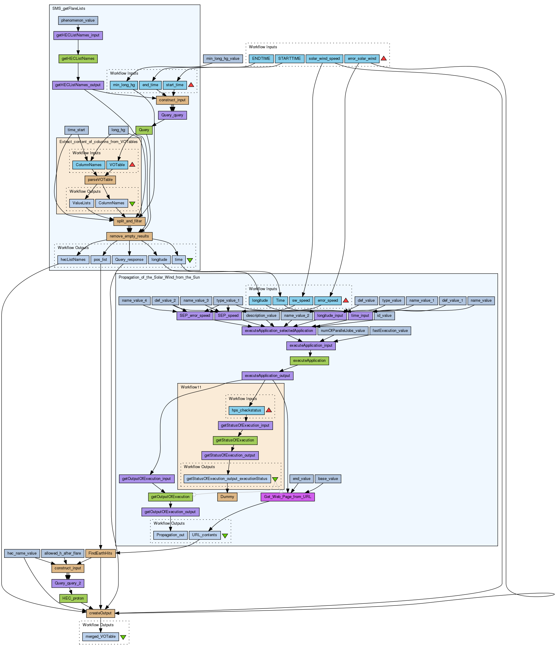This workflow uses flares listed in any HELIO HEC flare catalogue (using the semantic mapping service), checks whether these flares are connected to Earth via the Parker spiral, and looks for proton events at earth listed in the goes_proton_event list. The flare listing and the proton listing are combinded into a list of VOTable outputs (one VOTable per flare catalogue with results). |