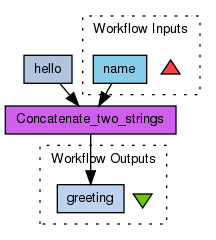 An extension to helloworld.t2flow - this workflow takes a workflow input "name" which is combined with the string constant "Hello, " using the local worker "Concatenate two strings", and outputs the produced string to the workflow output "greeting".
