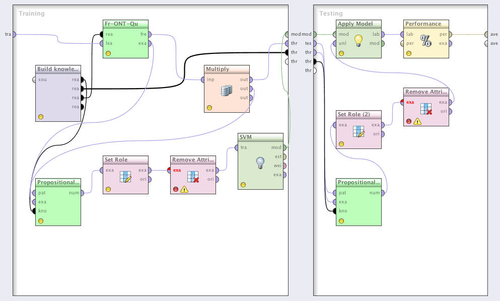 Performs a crossvalidation on a data set composed of meta-data of baseline RapidMiner workflows expressed in RDF with the DMOP's ontology terminology for representing processes. Includes discovery of a set of semantic features (patterns) by the Fr-ONT-Qu algorithm (‘workflow patterns’). Through propositionalisation approach those features may be used in an arbitrary (propositional) RapidMiner classification operator.