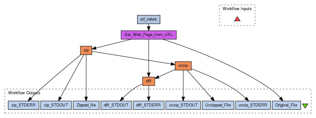 This workflow takes a fixed URL from which a text file is downloaded (output as Original_file). That file is zipped (output as Zipped_File) and then unzipped again (output as Unzipped_File). The orginal file and the unzipped version are then diff'd/