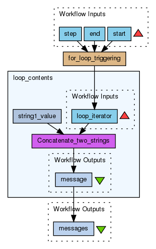 This workflow demonstrates how a nested workflow can be called an explicit number of times. Note that the loop iterator does not need to be used in the logic of the loop contents. It can be used as a sentinel (see the conditional workflow)