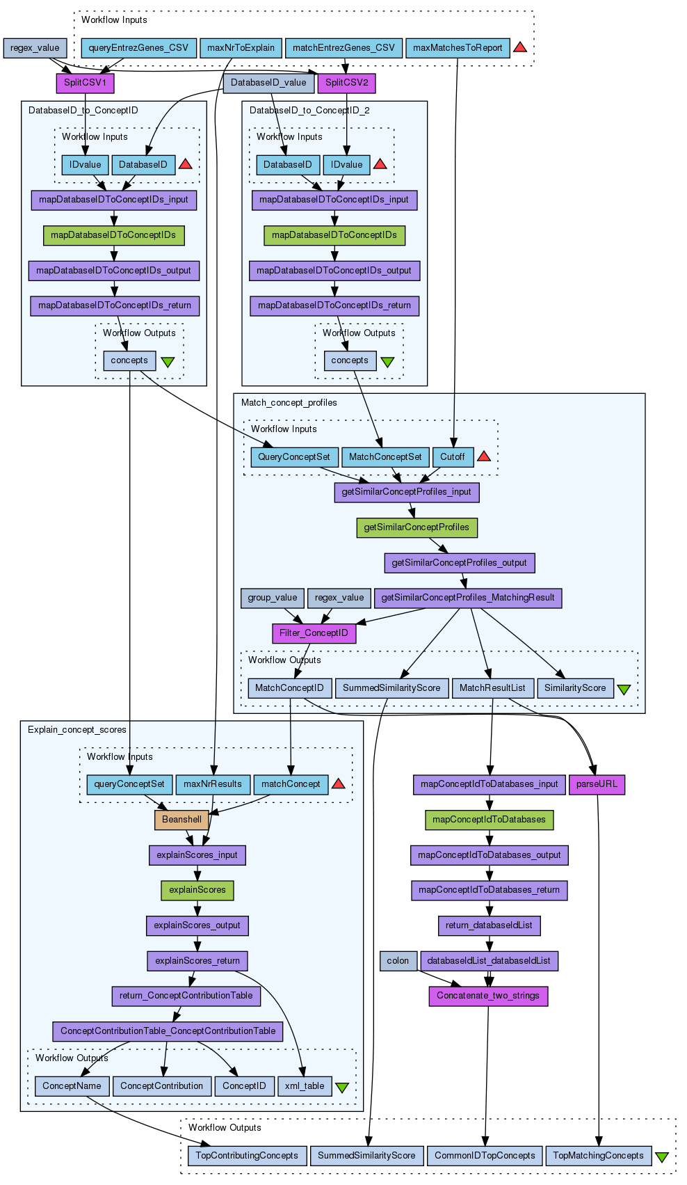 This workflow computes the match between two lists of Entrez Gene Identifiers by means of concept profile matching (Jelier et al., van Haagen et al.). The result of this is a list of concepts ordered by their matching score (the length of the list set by maxMatchNr). Of this list the summed scores are explained by computing the concepts that contribute most to the combination of the matching genes.