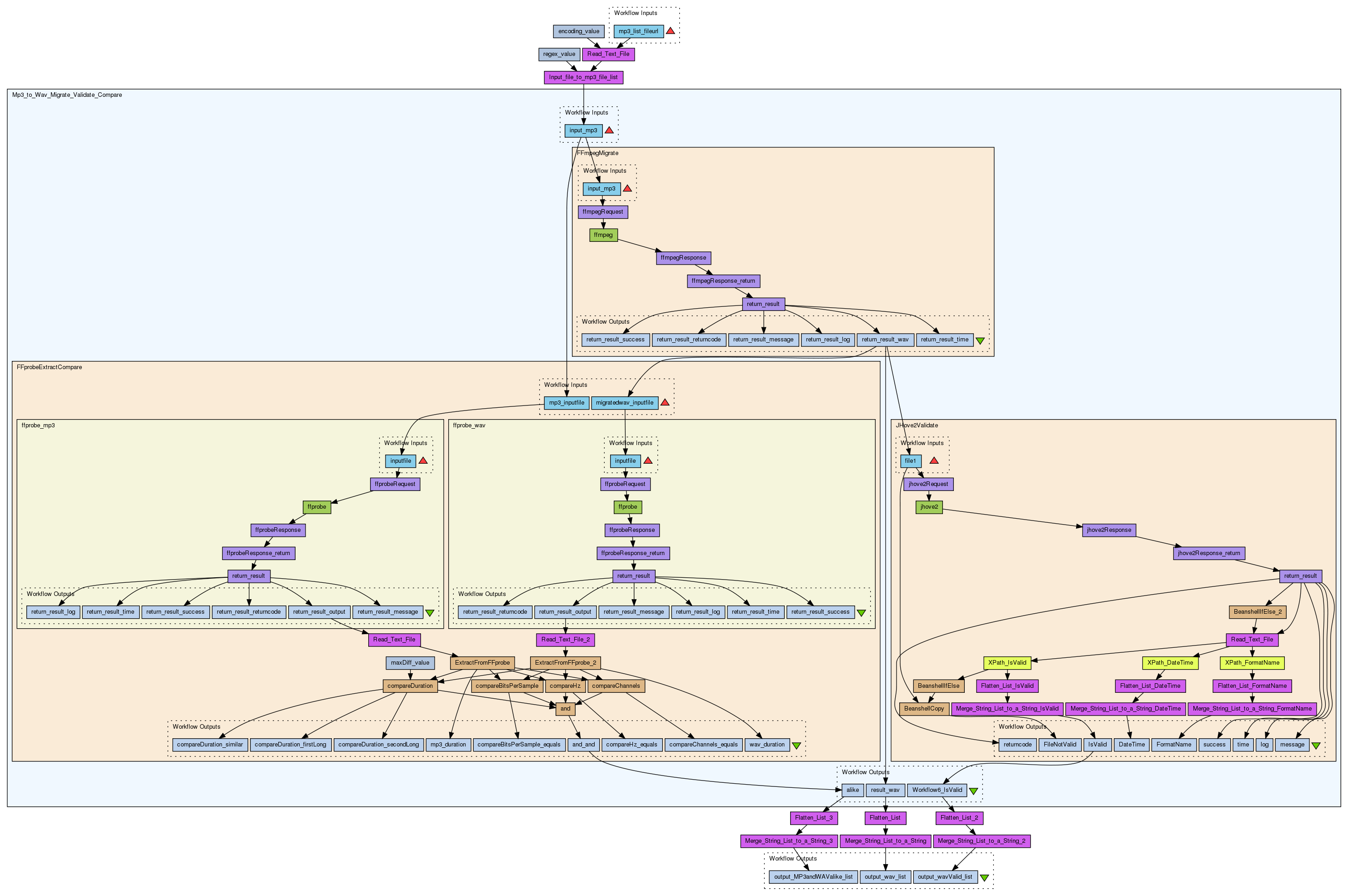 The workflow input value is a fileURL containing a list of input MP3 URLs. The output is a list of Wav fileURLs, a list of validation outputs (valid / not valid ) and a list of comparison outputs (properties alike / not alike).