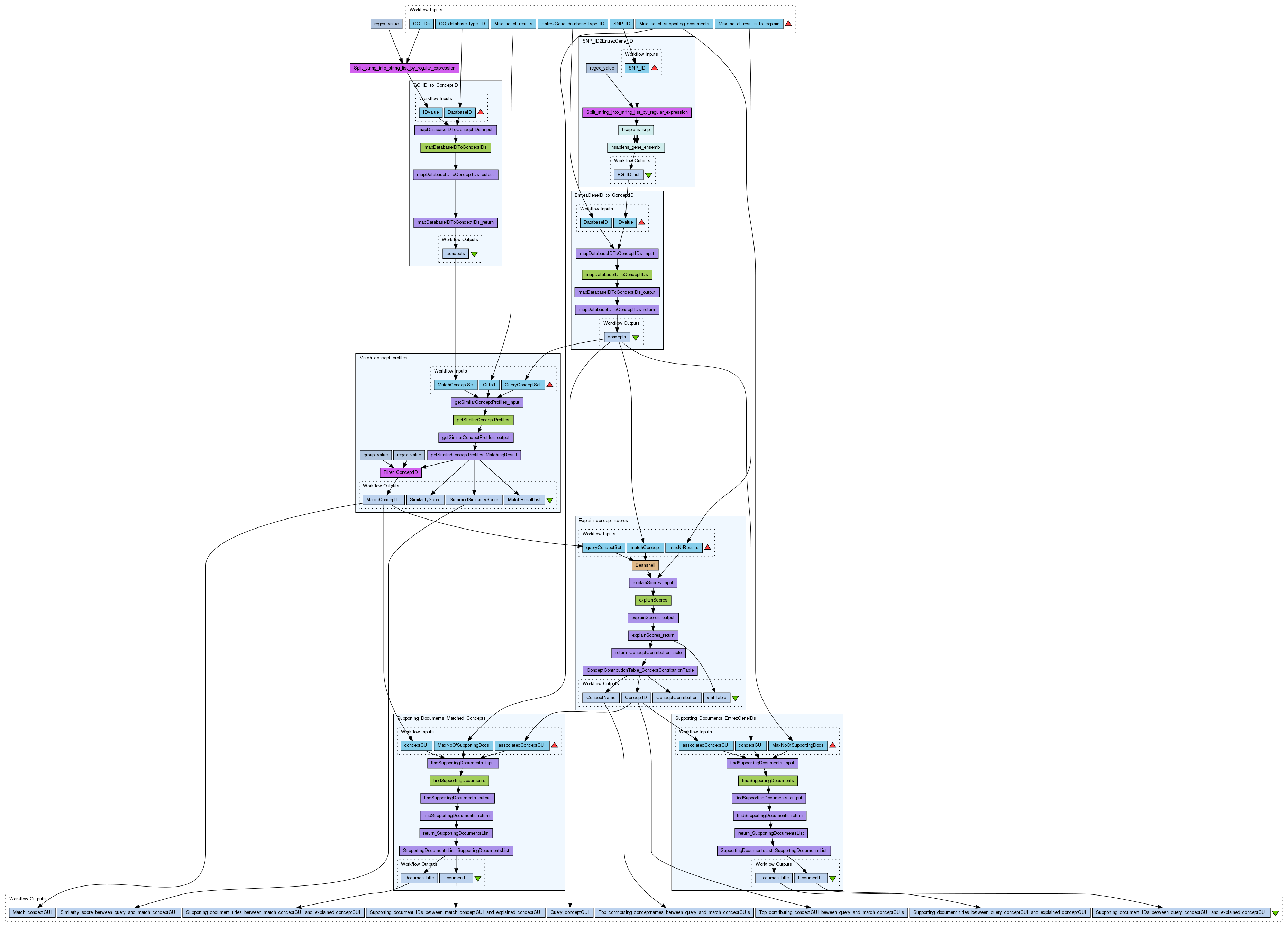 Currently, this workflow takes one SNP and one GO process as input, calculates the matching score between these, finds the concept that contributes the most to the match, and the documents that support this finding.