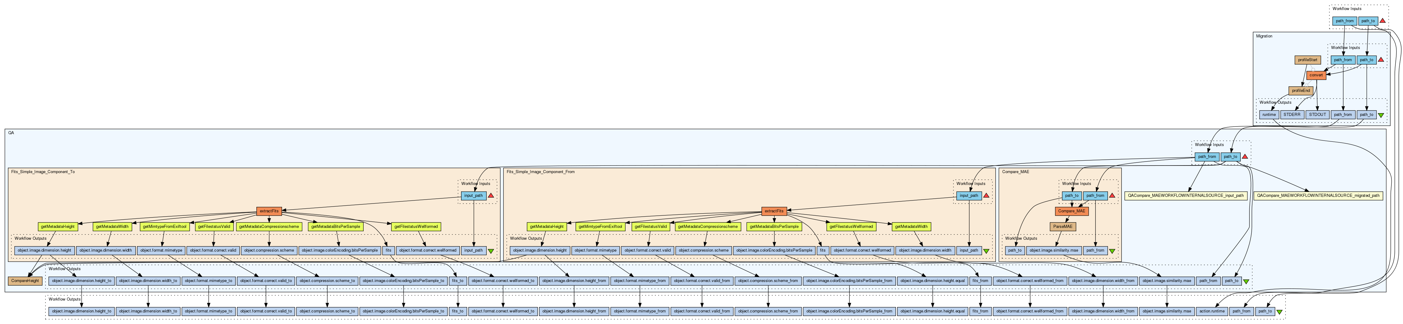 A simple executable plan containing a migration action component and a QA component. The migration action uses imagemagick convert. The QA component consists of two characterisation components (fits) and another QA components (imagemagick compare).