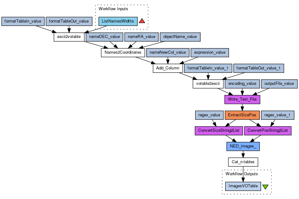 Extraction of metadata using NED Image Virtual Observatory Service into a single VOTable, providing a list of objects and the width for each field in arcmin. Among the most relevant metadata are the URL link to the FITS images. This Wf makes use of a Tool developed as an internal pyhton script file.