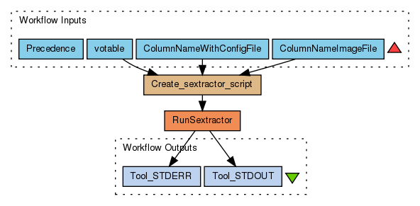 It runs sextractor and adjust the paramenters specified. This workflow has a dependency on the stil library (http://www.star.bris.ac.uk/~mbt/stil/). Sextractor is called by an bash script as 'sex'. Sextractor is called for every row in the votable. Columns where the configuration file and the image file name are defined must be especified. These files should be accesibles from taverna. ExperimentFolder provides the root folder for the experiment. If the configuration files contain references to other files, they must be accesible from taverna.