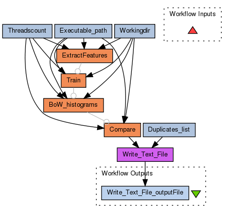 The workflow takes a list of digital documents as input, extracts SIFT features using image processing algorithms, creates dictionary of visual words, generates BoW (Bag of Words) histogramms and finds duplicates. The count of parallel threads can be passed as a parameter. Finally search results are stored in a text file that contains a list of possible duplicates with associated similarity score. This score values are spread between 0 (low similarity) and 1 (high similarity). Image comparison is performed by Matchbox command line tool and associated python scripts. The sources of the Matchbox tool are located in https://github.com/openplanets/scape/tree/master/pc-qa-matchbox.
