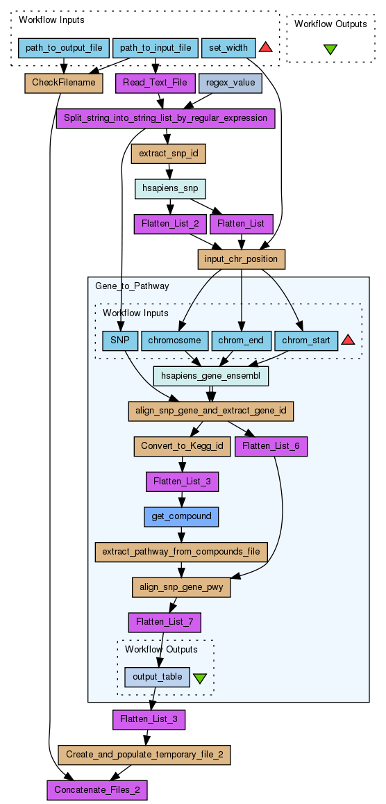 Genome-Wide Association studies (GWAS) with metabolomic phenotypes yield several statistically significant SNP-metabolite associations. To understand the biological basis of the association, scientists typically dwell on identifying genes in the vicinity of the SNP and the possible pathways that the gene participates in. The information needed to arrive at an understanding of the mechanistic basis of the association requires integration of disparate data sources. The purpose of this workflow is to take the GWAS output consisting of SNP-metabolite associations and return genes present in the vicinity of the SNP ( for example, ± 100 kb of the snp) and the pathways that these genes participate in. The user is provided with the choice of setting the flanking width to interrogate around the SNP.