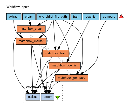 In this scenario matchbox will find duplicates in passed digital collection. All matchbox workflow steps are defined separately using input parameter sequence: clean, extract, train, bowhist and compare. User will get a list of duplicates in result. Matchbox in this scenario is installed on remote Linux VM. Digital collection is stored on Windows machine. |