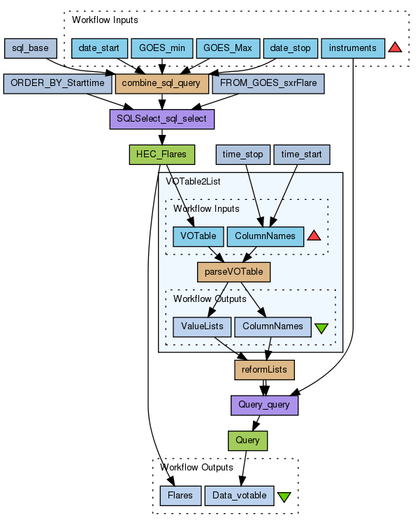 For a certain time range, it looks for flares between a energy range (GOES x-ray flare class), and it provides the observations for such time range for the list of instruments asked. It also provides the table of flares with its properties.