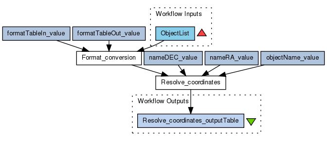 Snippet showing how to use AstroTaverna tool for coordinates resolving. The input is a list of source names and the output is a VOTable with three columns: SourceName, RAJ2000, DECJ2000.