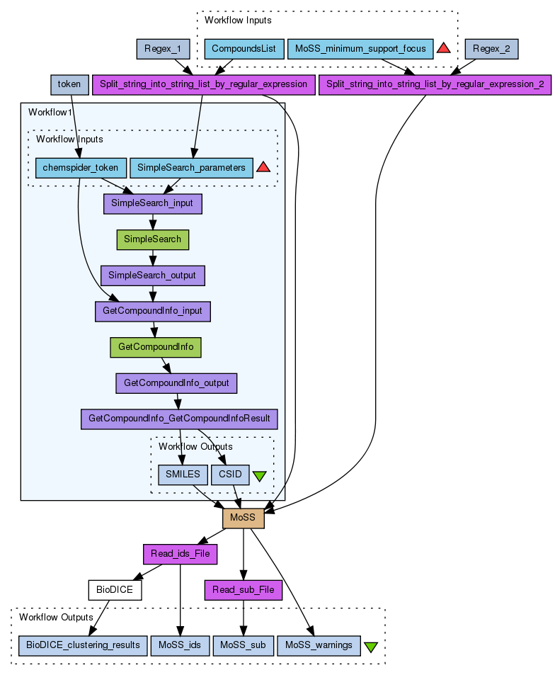 This workflow downloads an input set of molecular compounds in SMILES format, using Chemspider service. The most frequent molecular fragments are extracted by means of MoSS tool (see http://www.borgelt.net/moss.html) , in order to obtain a set of features for each compound. Then a clustering and a visual exploration of the input dataset is performed by BioDICE service (see http://biolab.pa.icar.cnr.it/biodice.html), implementing Fast Learning Self-Organized Map (FLSOM) algorithm. Finally the output is a list of compounds for each cluster. The workflow requires as input a text file with a list of compounds names (or Chemspider IDs) and a file with a list of MoSS minimal support focus values (see MoSS docuemntation http://www.borgelt.net/doc/moss/moss.html for a detailed description).