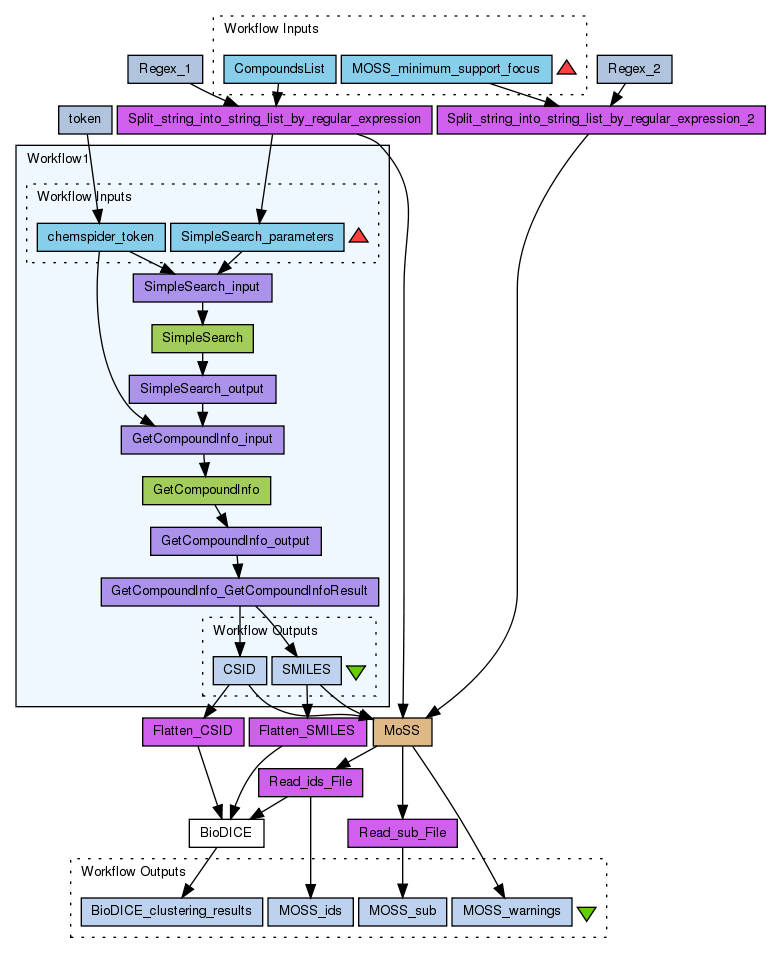 This workflow downloads an input set of molecular compounds in SMILES format, using Chemspider service. The most frequent molecular fragments are extracted by means of MoSS tool (see http://www.borgelt.net/moss.html) , in order to obtain a set of features for each compound. Then a clustering and a visual exploration of the input dataset is performed by BioDICE service (see http://biolab.pa.icar.cnr.it/biodice.html), implementing Fast Learning Self-Organized Map (FLSOM) algorithm. Finally the output is a list of compounds for each cluster. The workflow requires as input a text file with a list of compounds names (or Chemspider IDs) and a file with a list of MoSS minimal support focus values (see MoSS docuemntation http://www.borgelt.net/doc/moss/moss.html for a detailed description).