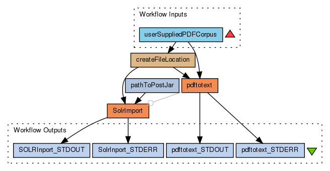 This workflow extracts the text of a .pdf file and stores it in a .txt file. Then it stores the .txt file in a Solr database.