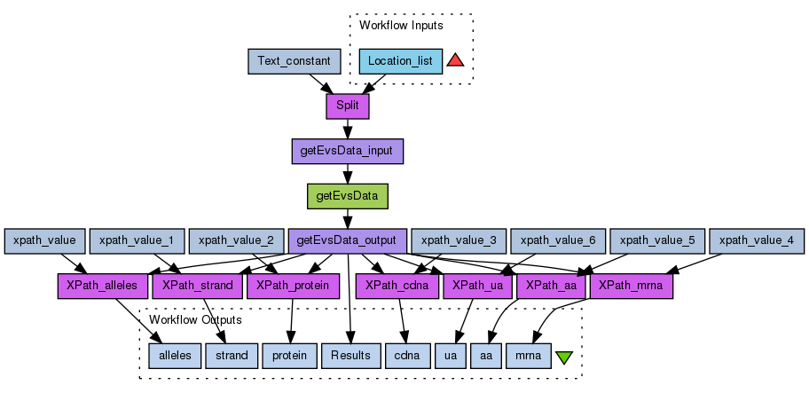 The workflow takes a list of chromosomal positions (in the format chr:pos e.g. 2:139574) and returns a selection of data in the Exome Variant Server (http://evs.gs.washington.edu/EVS/).