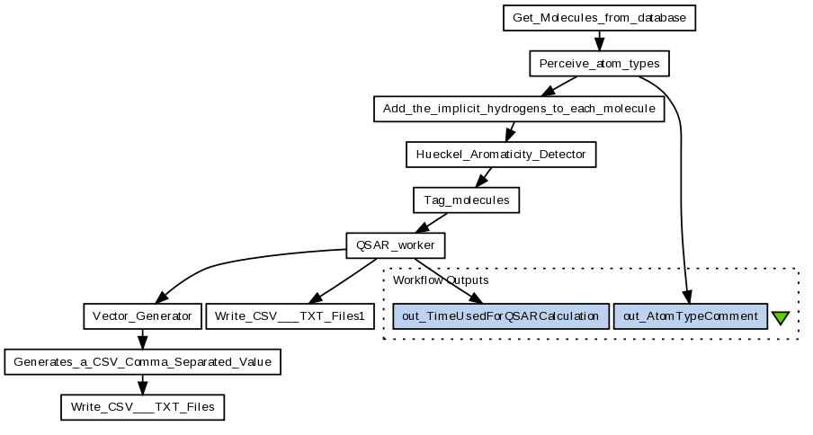 This workflow loads molecules from a database. Each molecule goes through the atom typing, gets its explecite hydrogens and the detection of the hueckel aromaticity. After that different qsar properties will be calculated. The output of this workflow will be a qsar vector as a csv file and a file which contains the time needed to calculate each qsar property.