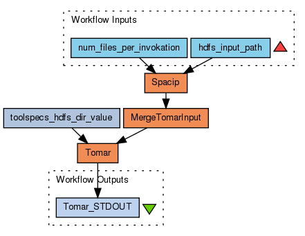 The workflow uses Spacip (https://github.com/shsdev/spacip) to prepare ARC web is a tool to prepare ARC web archive container files by unpacking the compressed files in HDFS and creates input files which can be used by Tomar (https://github.com/openplanets/tomar). After merging the mapper output files from Spacip (MergeTomarInput) into one single file, it can be used by Tomar as input. The tool invokation depends on a tool specification file which must be available in HDFS, this is explained in the Tomar documentation.