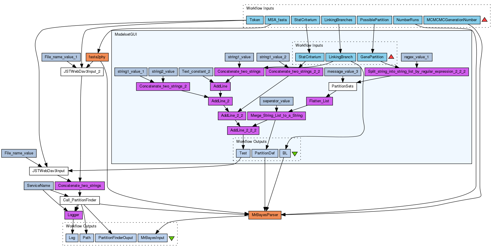 Selecting Evolutionary Model for a phylogenetic inference using partitionFinder program. The program (http://www.robertlanfear.com/partitionfinder/) search best candidate model that satisfy need of the different partition. The program do not explore all possible model that could be implemented in mrbayes, in fact it do not allow for link of subsitution matrix but different base frequency across partitions, or to link branch lenght across some partitions but not all. For a greater fine tuning of model the user is advised to use the GUI interface present in the phylogenetic inference pipeline |