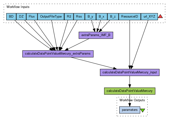 Workflow for Taverna based on the IMPEx-FP7 method calculateDataPointValueMercury. This method can be used to return the magnetic field (calculated by SINP PMM) in given points inside the Hermean magnetosphere.