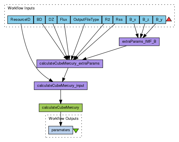 Workflow for Taverna based on the IMPEx-FP7 method calculateCubeMercury. This method returns the magnetic field, calculated by SINP PMM, in grid points of a cube with chosen boundaries inside the Hermean magnetosphere with chosen sampling.