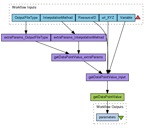Workflow for Taverna based on the IMPEx-FP7 method getDataPointValue. This method is used to compute values of various physical quantitites (e.g. density, magnetic field strengths etc.) for a given simulation run at a user given set of 3D points.