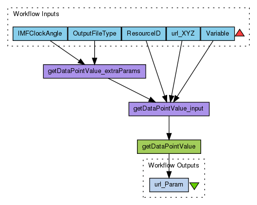Workflow for Taverna based on the IMPEx-FP7 method getDataPointValue. This is a generic method which can be used to return parameters for 0D, 1D, 2D, or 3D.