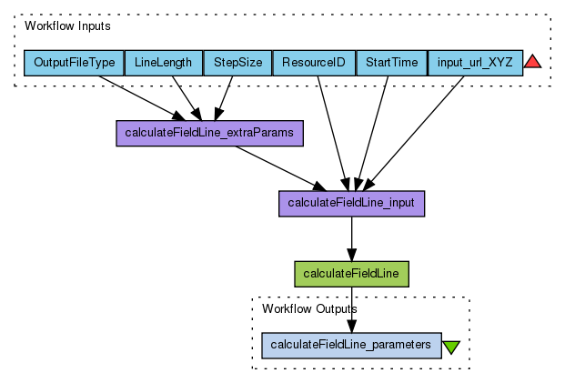 Workflow for Taverna based on the IMPEx-FP7 method calculateFieldLine. This method can be used to return the field lines (calculated by SINP PMM), which start in given points inside the planetary magnetosphere and in different time moments for each point, and the magnetic field along these lines.