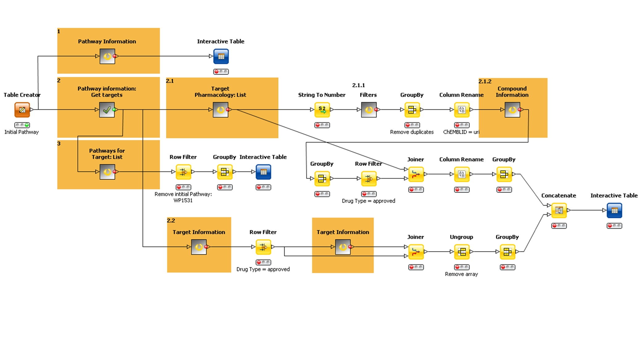 3. Other Pathways where a certain target is present are retrieved using ‘Pathways for Target: List’ API call. After that, we remove the initial pathway using the ‘row filter’ node and we group them by ‘target name’.