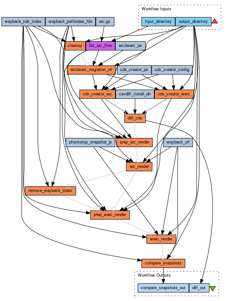 The workflow has an input port “input_directory” which is a local path to the directory containing the ARC files, and an input port “output_directory” which is the directory where the workflow outputs are created. The files in the input directory are migrated using the “arc2warc_migration_cli” tool service component to perform the migration. The “cdx_creator_arc” and “cdx_creator_warc” tool service components create cdx index files for both, the original ARC file and the migrated WARC file which, subsequently, are compared by the “cdx_comparison” tool service component that uses the CSV file comparison tool csvdiff (http://csvdiff.sourceforge.net) to compare defined columns of the two CSV files. Furthermore, via deployment to a wayback web application deployed in an Apache Tomcat servlet container, screenshots are taken from rendered HTML pages retrieved from ARC and WARC container file records respectively. The screenshots are then compared using Exiftool (geometric properties) and ImageMagick (measure: AE).
