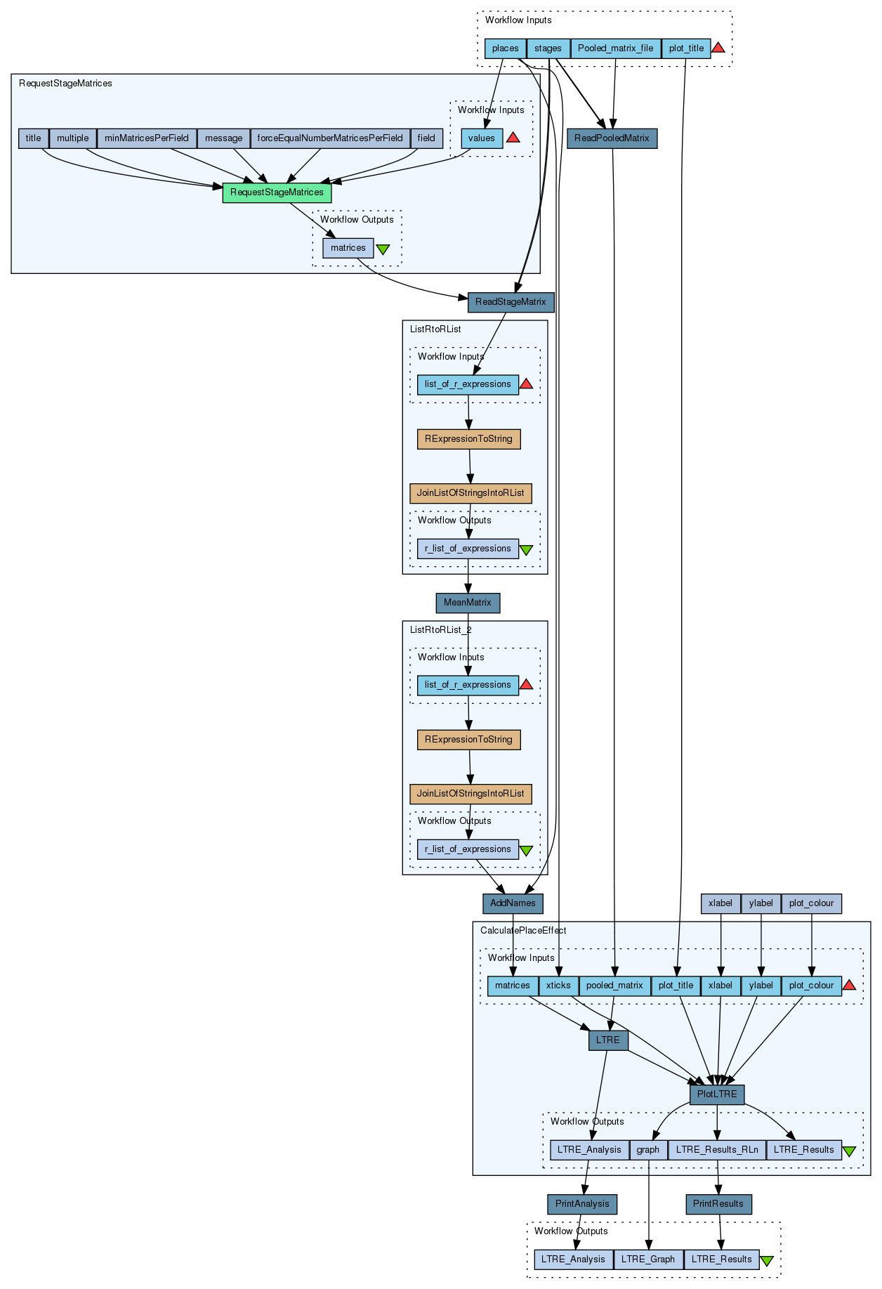 The Life Table Response Experiments place effect workflow provides an environment to analyse one or more matrices (e.g. matrices of different years from the same place) from two or more places. The objective of this workflow is to determine the effects of the research places or localities (2 or more) on ?. This workflow performs a fixed LTRE, one way design (Caswell 2001).